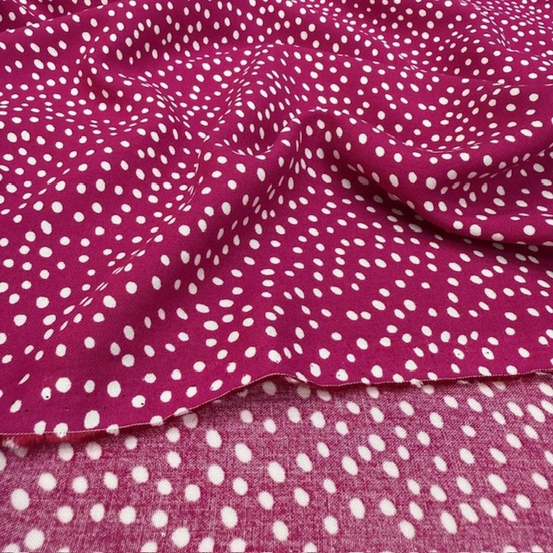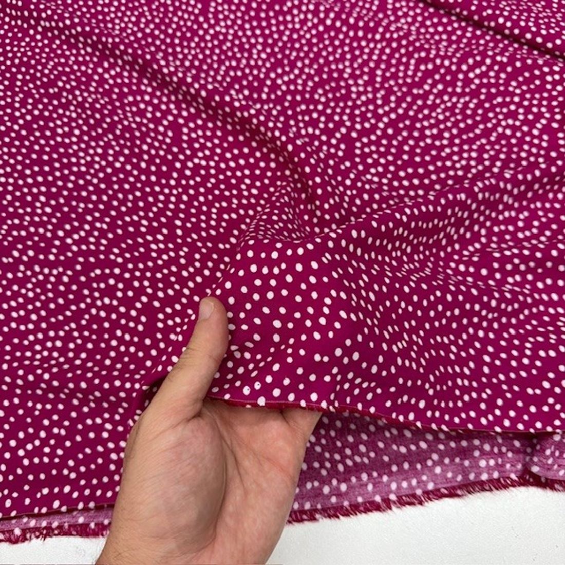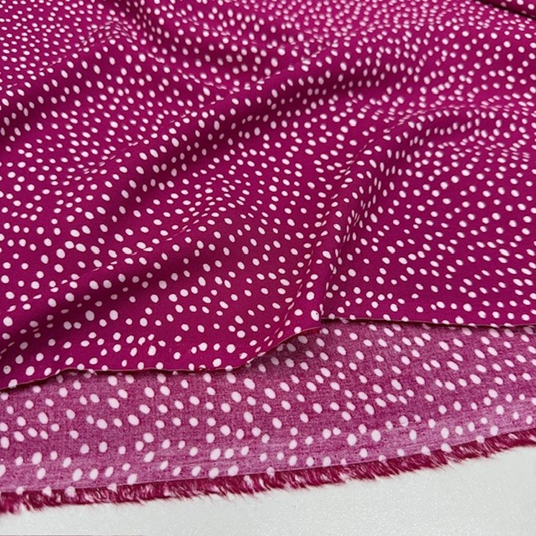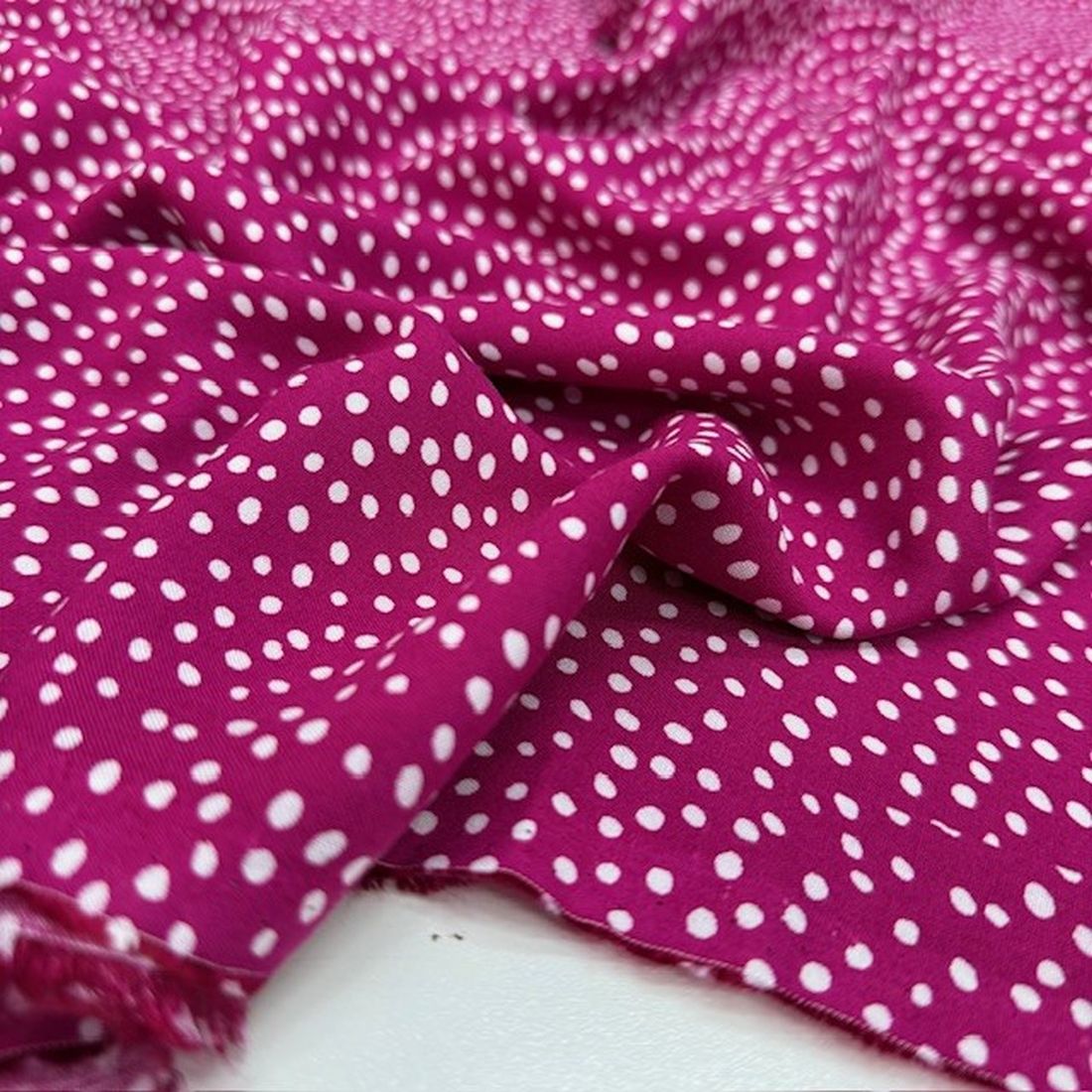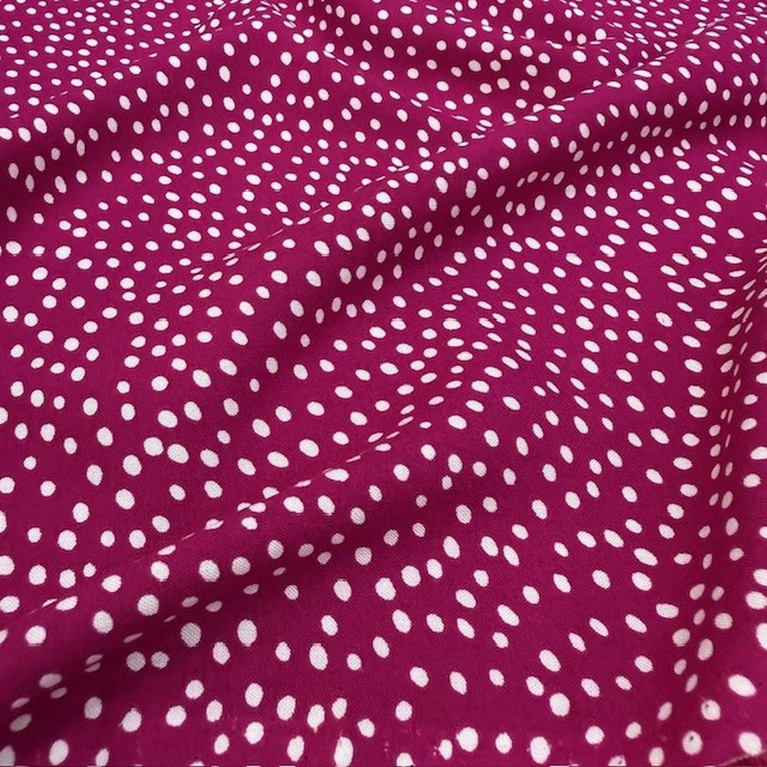 Pembe Beyaz Puantiyeli Pamuklu Viskon Kumaş YVZ : %100 pamuktur. Yazın terletmeyen kışın üşütmeyen doğal kumaştır. Saf pamuk olduğundan dolayı kırışma yapabilmektedir. Nefes alabilen bir yapıda olması nedeniyle, terletme özelliğini minimum seviyede tutan bir kumaştır. Yıkama ve ütüleme işlemlerinde ısı oranına dikkat edilmesi gerekmektedir. Doğal yapısı gereği, alerjik reaksiyona sebebiyet vermez. Dökümlü ve havalı bir kumaştır.