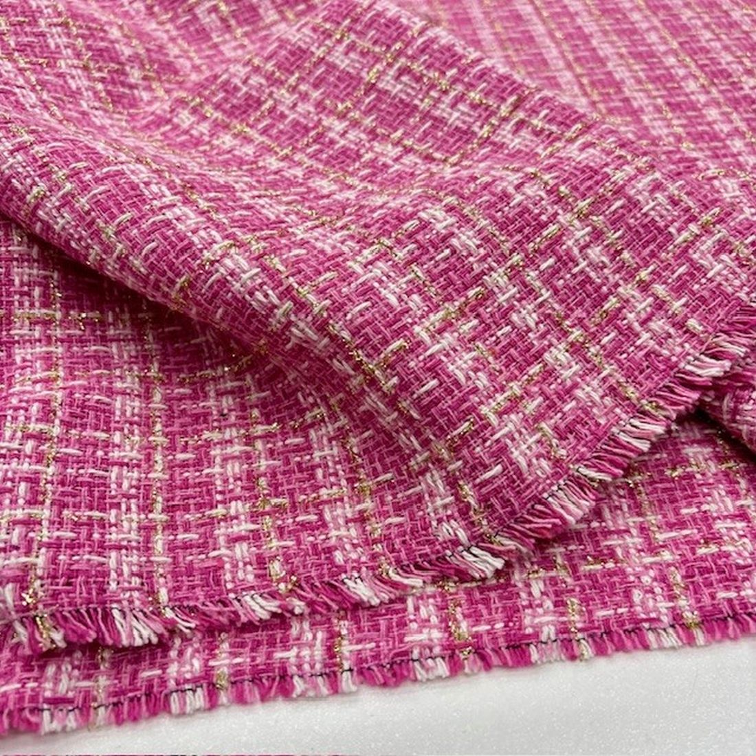 Altın İplikli Koton Şanel Kumaş Pembe ALK ;Lüks Şanel Kumaşımızla zarafetin zirvesini yaşayın. Bu Moda kumaşı, ister ceket, elbise, etek veya modaya uygun bir palto olsun, moda kreasyonlarınızı geliştirmek için tasarlandı.
